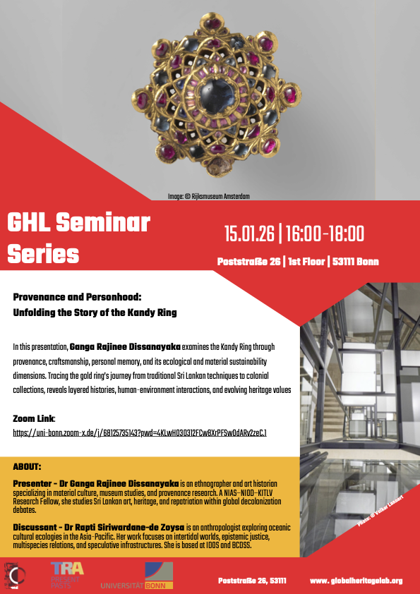 The GHL seminar series will begin in 2026 with a seminar on “Provenance and Personhood: Unfolding the Story of the Kandy Ring“. In this session, we are pleased to welcome Ganga Rajinee Dissanayaka, who will examine the Kandy Ring through provenance, craftsmanship, personal memory, and its ecological and material sustainability dimensions. Tracing the gold ring’s journey from traditional Sri Lankan techniques to colonial collections, reveals layered histories, human-environment interactions, and evolving heritage values.